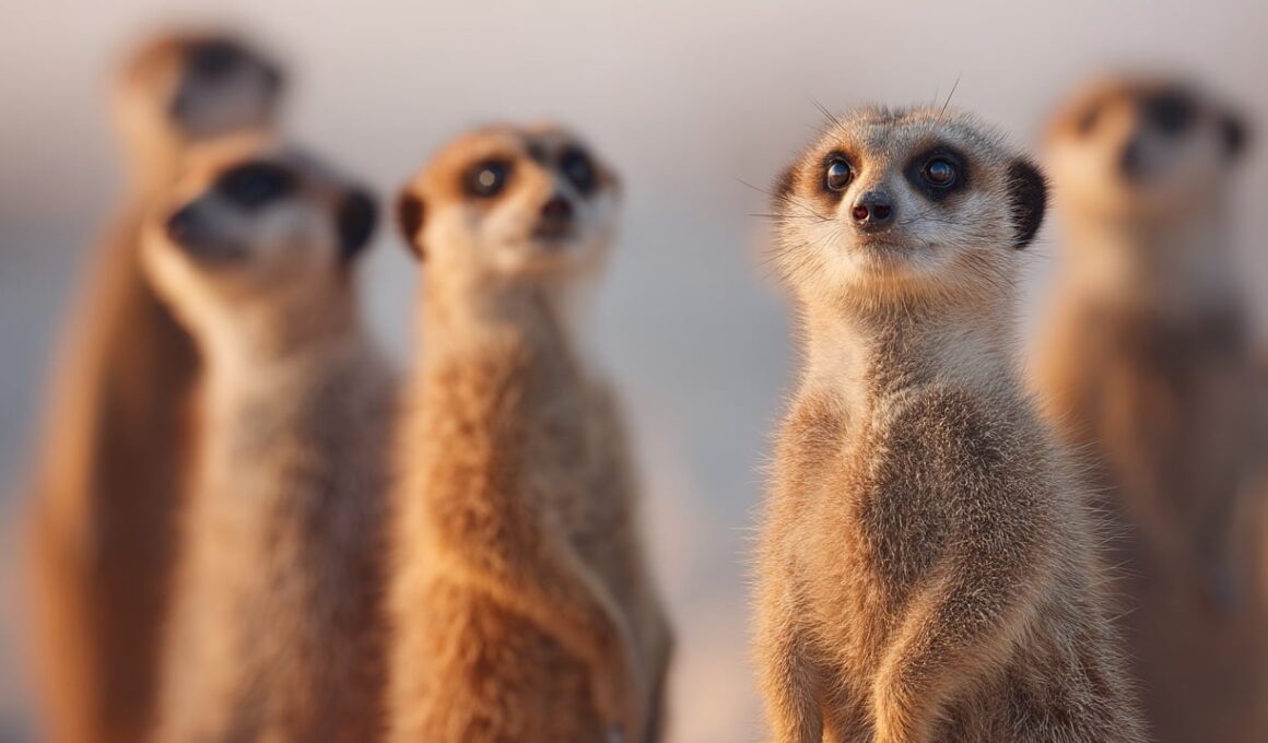 Meerkats display social behaviors exhibiting both unity and cooperation, critical to their survival. One significant aspect of their interactions is the sentinel behavior, where one meerkat stands guard while others forage. This sentinel takes on a critical role, alerting the group to potential predators. This vigilance exemplifies the altruistic tendencies seen in secretive social structures. Moreover, this behavior underscores the importance of interdependence, showing how collective efforts enhance group safety. Another noteworthy behavior is alarm calling, where meerkats use distinct vocalizations to communicate threats. The urgency of the call can vary based on predator type, showcasing their sophisticated communication system. Each meerkat learns specific calls, enhancing their survival skills, creating a foundation of social learning that is passed through generations. Furthermore, the bonds formed through these communal activities lead to strong familial ties, encouraging collaboration. Territorially, meerkats fiercely protect their resources and territory, engaging in physical confrontations with rival groups. These defense strategies exemplify their cohesive behavior, cementing alliances and promoting unity. Observing these behaviors provides insights into how meerkat societies operate, revealing the intricate dynamics that contribute to their success as one of nature’s most sociable creatures.