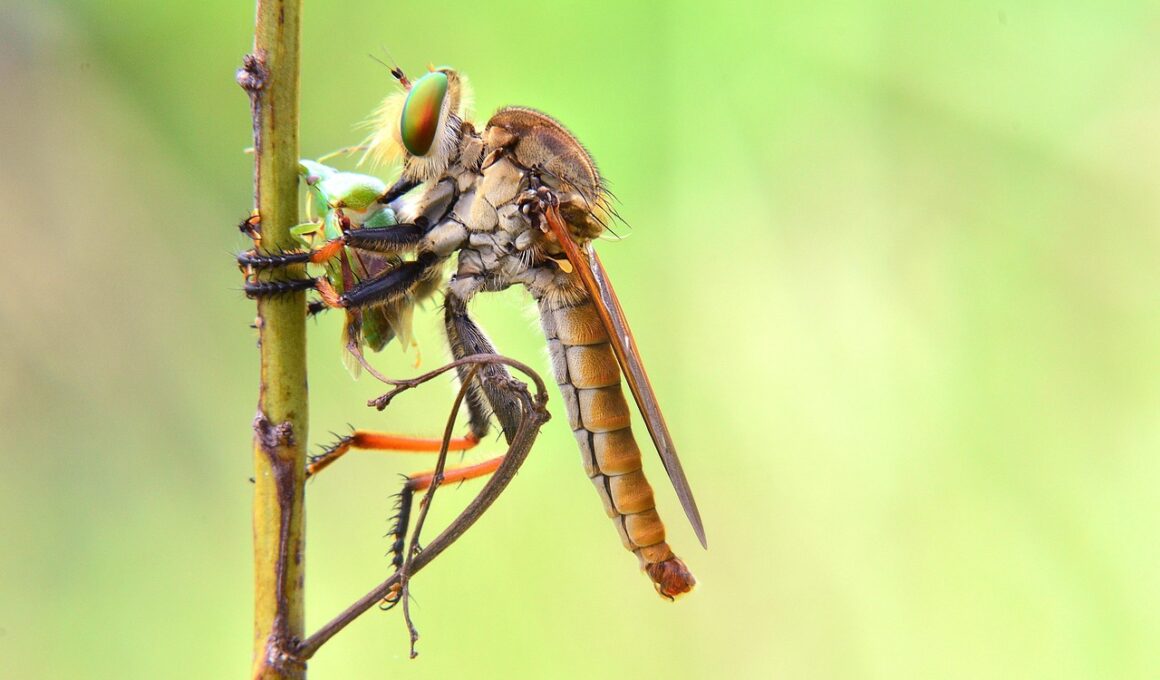 Climate change presents significant challenges to the habitats where robber flies thrive. As temperatures and weather patterns shift, the traditional environments that support these insects may degrade or disappear entirely. Changes in temperature can prompt a northward migration of species as they seek cooler climates, disrupting local ecosystems. Furthermore, urban expansion and agricultural practices exacerbate habitat loss, leaving fewer safe spaces for these essential pollinators. The implications extend beyond mere displacement; increased flooding, drought, and altered rainfall patterns can directly harm their reproductive cycles. Loss of habitat also forces robber flies to compete for dwindling resources, triggering shifts in their population dynamics. The intertwining of ecological factors makes their survival even more precarious as food sources may also experience scarcity due to changes in climate. Additionally, invasive species may flourish in warmer climates, further challenging the survival of native robber fly populations. Connecting the dots between temperature fluctuations, habitat loss, and these predatory insects’ adaptability highlights an urgent need for conservation. Researchers must conduct further studies to monitor and understand these interactions better, fostering effective strategies for protecting robber fly populations.