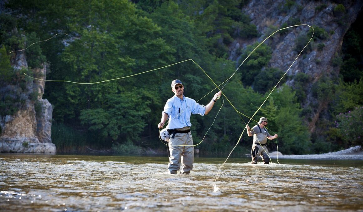 Summer brings longer days and warmer temperatures, which can present challenges for fly fishing enthusiasts. Fish tend to move to deeper waters during peak temperatures, seeking cooler environments, making it crucial to adapt your tactics. Early mornings and late evenings can yield the best results as fish are more likely to feed at these times. Switching to heavier lines and larger, more vibrant flies can help catch a fish’s attention as the increased sunlight can make them less active throughout the warmer hours. Consider exploring shaded areas under structures to enhance your bait visibility, as fish often seek refuge from direct sunlight. Pay attention to insect activity, particularly terrestrials and hoppers, which are prevalent in streams and can trigger aggressive feeding amongst fish species. Formulating your fishing schedule around hatch timings can bring better chances for a successful day on the water. Learn about the local stream flows, as high water can change fish locations significantly. Staying aware of current environmental conditions is essential to refine your approach continuously and optimize your time spent fishing, significantly increasing your chances of landing that prized catch. These strategies can enhance your efforts in crown-level success.