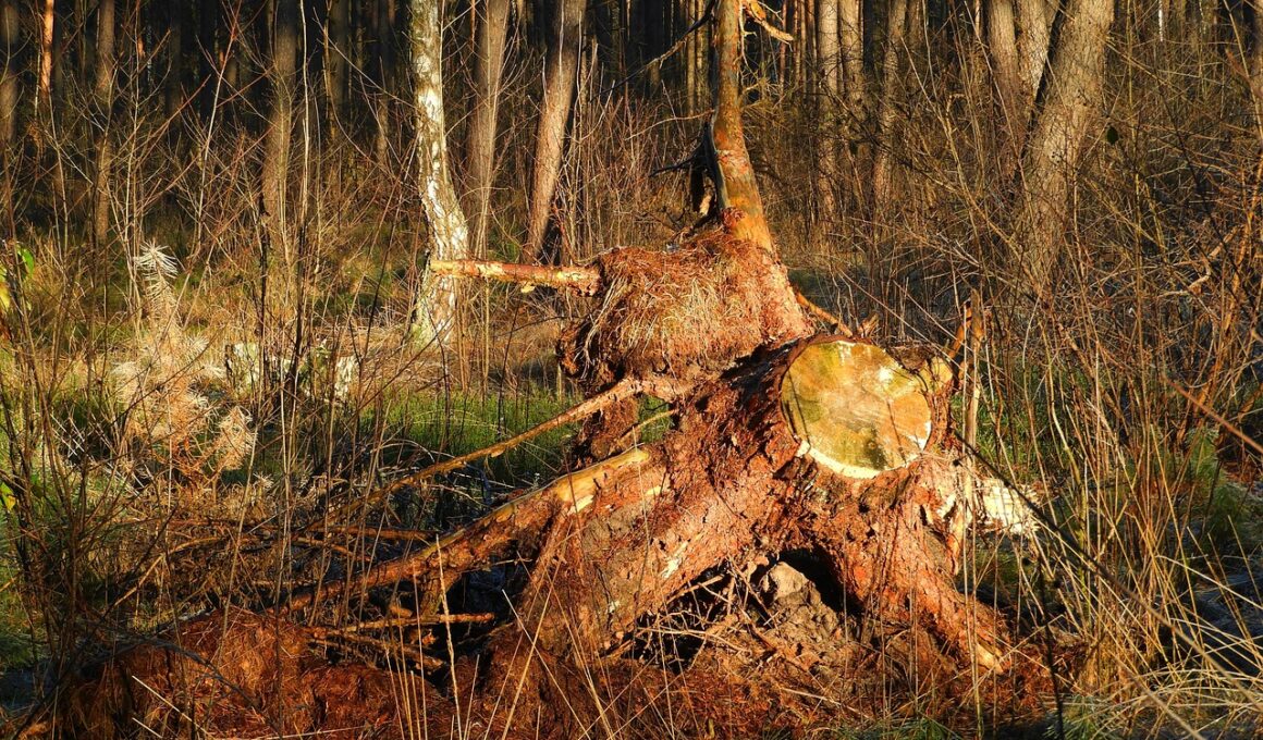 Furthermore, deadwood has significant importance for fungi and microorganisms. These organisms contribute to nutrient cycling and play a key role in soil health. Fungi break down complex organic materials in deadwood, returning vital nutrients to the soil and fostering new growth. The nutrients released support plant life and also affect soil structure, benefiting overall forest health. Microorganisms residing within the decaying wood engage in symbiotic relationships, enhancing the biodiversity of the ecosystem. As they thrive, these microorganisms also aid in decomposing deadwood, accelerating its breakdown process. Consequently, this dynamic enhances the forest’s fertility, supporting both flora and fauna. The intricate interactions between deadwood, fungi, and microorganisms illustrate the profound ecological functions of deadwood in forest environments. It becomes clear that deadwood not only serves as visible habitat but also operates at microscopic levels, integrating into complex biological networks. This holistic view encourages more extensive appreciation and understanding of the roles that such organic materials play in the vitality of temperate forest habitats.