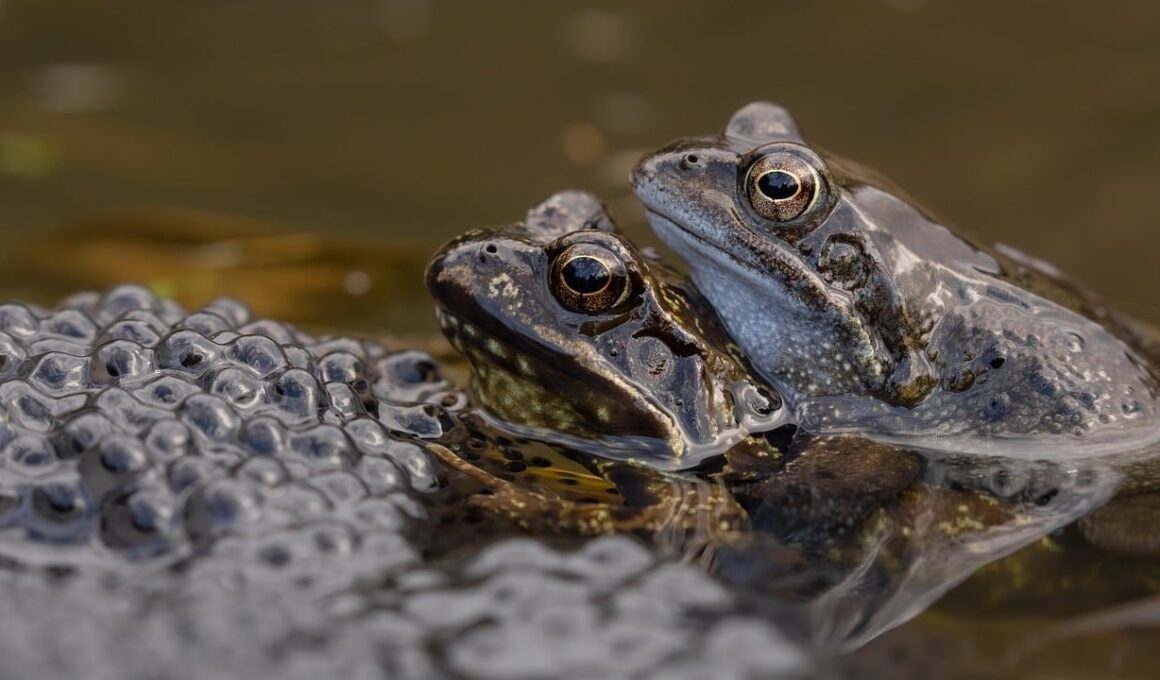 Finally, managing environmental factors is vital for amphibian health during the breeding period. Water quality, temperature, humidity, and substrate type can significantly influence reproductive success. Optimizing these parameters directly impacts the overall health and stress levels of amphibians during breeding, affecting their vulnerability to diseases. Breeders should monitor water parameters regularly and make adjustments to ensure ideal conditions for different species. Implementing proper filtration systems and conducting regular water changes are necessary to maintain high-quality aquatic environments. Temperature regulation is equally crucial; sudden shifts can stress breeding amphibians, resulting in poor health. Humidity levels should be monitored to emulate the natural habitat where amphibians thrive. Furthermore, providing natural substrates and hiding spots can promote healthy behaviors, reducing stress. Adequate spaces for breeding activities can significantly improve overall breeding outcomes. Alongside environmental factors, limiting exposure to contaminants is essential; breeding amphibians must be kept away from polluted waters and chemicals. By addressing these various facets, breeders can create a conducive environment that promotes health and minimizes disease risks, thus enhancing the potential for successful amphibian breeding.