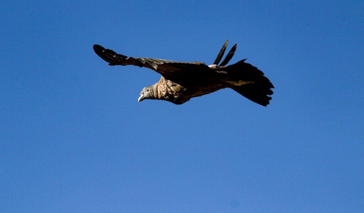 Condors have exemplary behavior when soaring in the sky, demonstrating their remarkable adaptations to flight. Their massive wingspan can reach up to 10 feet, allowing them to glide efficiently over vast distances. Utilizing thermal updrafts, condors can soar high without much flapping; this energy-efficient flight technique is crucial for their scavenging lifestyle. While in flight, these birds display a methodical and deliberate approach to scouting for food opportunities, often circling over potential feeding sites. When food is nearby, condors may engage in aerial displays, showcasing courtship behaviors and social interactions. Additionally, flying together strengthens social bonds within flocks. Young condors often learn from older adults, picking up essential flight skills necessary for scavenging. Observing the interactions and hierarchies within the air reflects their social structure even when soaring high above. Weather conditions play a significant role in their flying behavior as well, since they prefer soaring in warm, sunny weather, which provides ideal thermal updrafts. Monitoring these behaviors is essential for capturing a holistic understanding of condor ecology, which underscores their importance in maintaining healthy ecosystems.