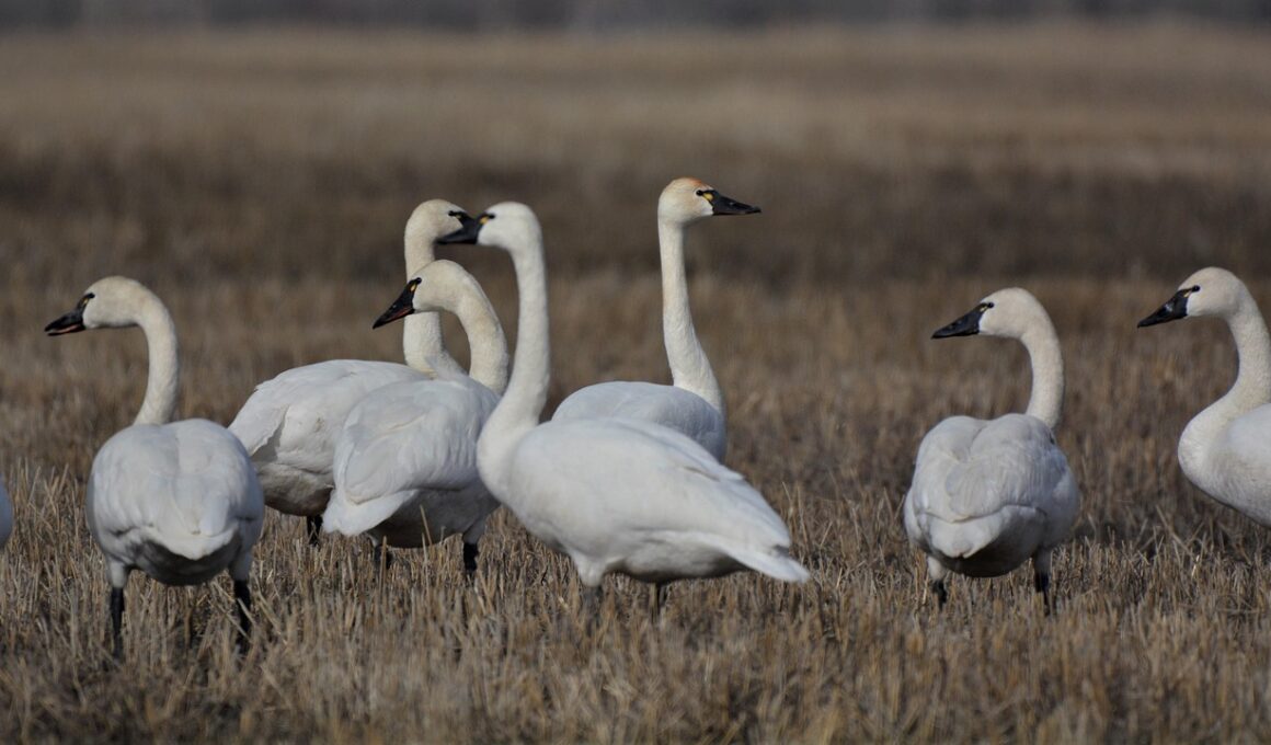 The feeding habits of Tundra Swans reflect their adaptability to the cold climates in which they thrive. They primarily forage in shallow waters and wetlands during warmer months for aquatic plants, grains, and small invertebrates. Their long necks allow them to tip and reach beneath the water’s surface, retrieving food from depths that many other birds cannot access. While foraging, Tundra Swans utilize a unique feeding technique known as “dabbling,” where they simultaneously submerge their heads in search of nutrition. In addition, Tundra Swans often graze on agricultural fields, where they consume leftover grains after harvest. This behavior not only supplements their diet but creates a close relationship with human agricultural activities, enabling coexistence between wildlife and farming. In wintering areas, they rely on accessible food sources, resulting in increased competition among swans, which can influence their social dynamics. Their feeding strategy is crucial to maintaining healthy energy reserves needed for migration back to their breeding grounds. Furthermore, their foraging patterns also play a significant role in the ecosystem, providing natural control of aquatic vegetation and contributing to the overall health of their habitats.